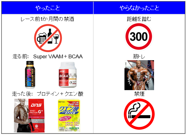 1. 禁酒:理由は単純で、体重管理のため。お酒は勿論好きだが、元々、飲む頻度は低い。平日は、夕食後、オフィスに戻って仕事するから、会食とか飲み会がない限り、飲めない。気分を高めるためにも、レース前1か月の禁酒は、今でもルーティーンとなっている。