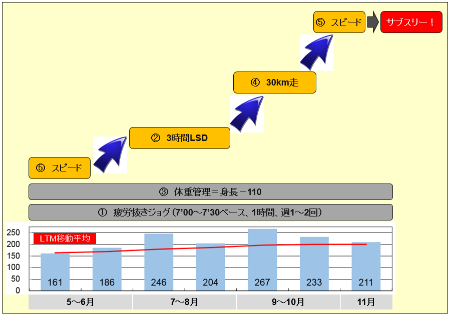 月間300kmが必要と言われる中、平均200km、週3回の練習で、どうやってサブスリーを達成できるか。当時、僕なりに色々考えた。