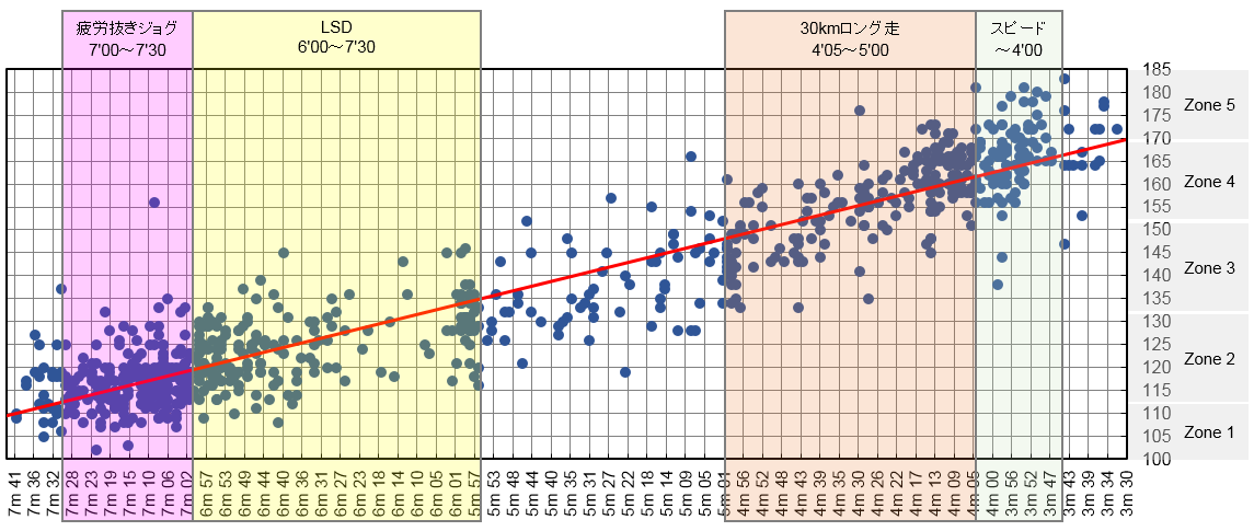 下のチャートは、縦軸が平均心拍数、横軸が平均ペース、赤線が近似曲線。Zoneはガーミンの設定によるもの。