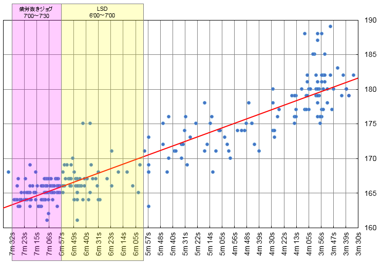 上のチャートと照らし合わせれば、疲労抜きジョグやLSDの適正ペースがどこにあるべきか、自身の心拍数からはじき出されるような気がする。もっとも、疲労抜きジョグは1kmを全力で走った場合の、2倍以上遅いペースになる必要があるとは思う。
