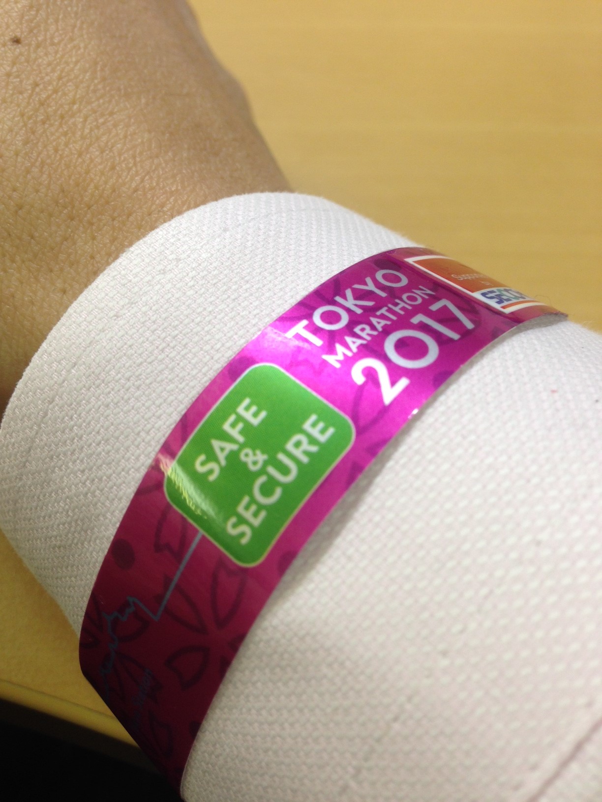 これが、今回から導入されたセキュリティバンド。チャリティはピンク。つけた瞬間からゴールするまで外しちゃいけないらしい。