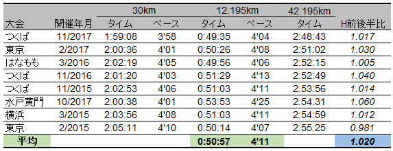 そこで、最近の記録を、30kmまでと、残りの12.195kmで分けてみる。