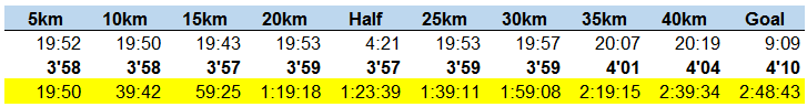 30kmまでは3'57ペース、1:58:30を目標にし、つくばと同じような落ち込みで粘る!