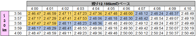 30kmまでの設定ペースと、残りのペースの組み合わせを考える。お馴染みのデータテーブルがこちら。オレンジは2:48切り、青はキロヨンカット+PB更新。