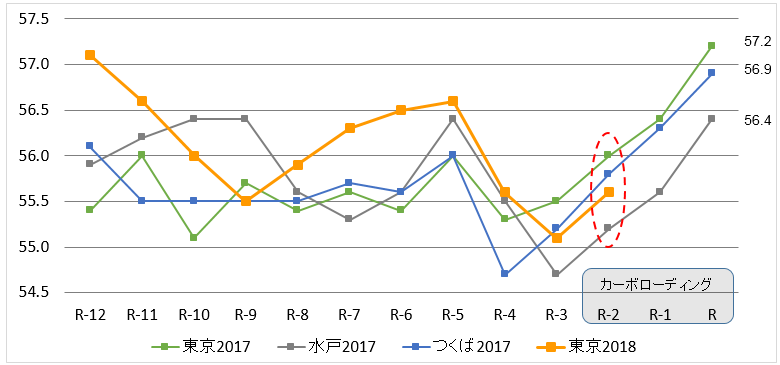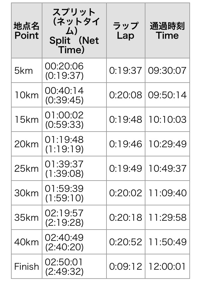 キロヨンカットできたつくばでは、30km通過が設定より8秒オーバーだったものの、その後は想定よりも粘れて、サブ50を飛び越えたタイムを出せた。