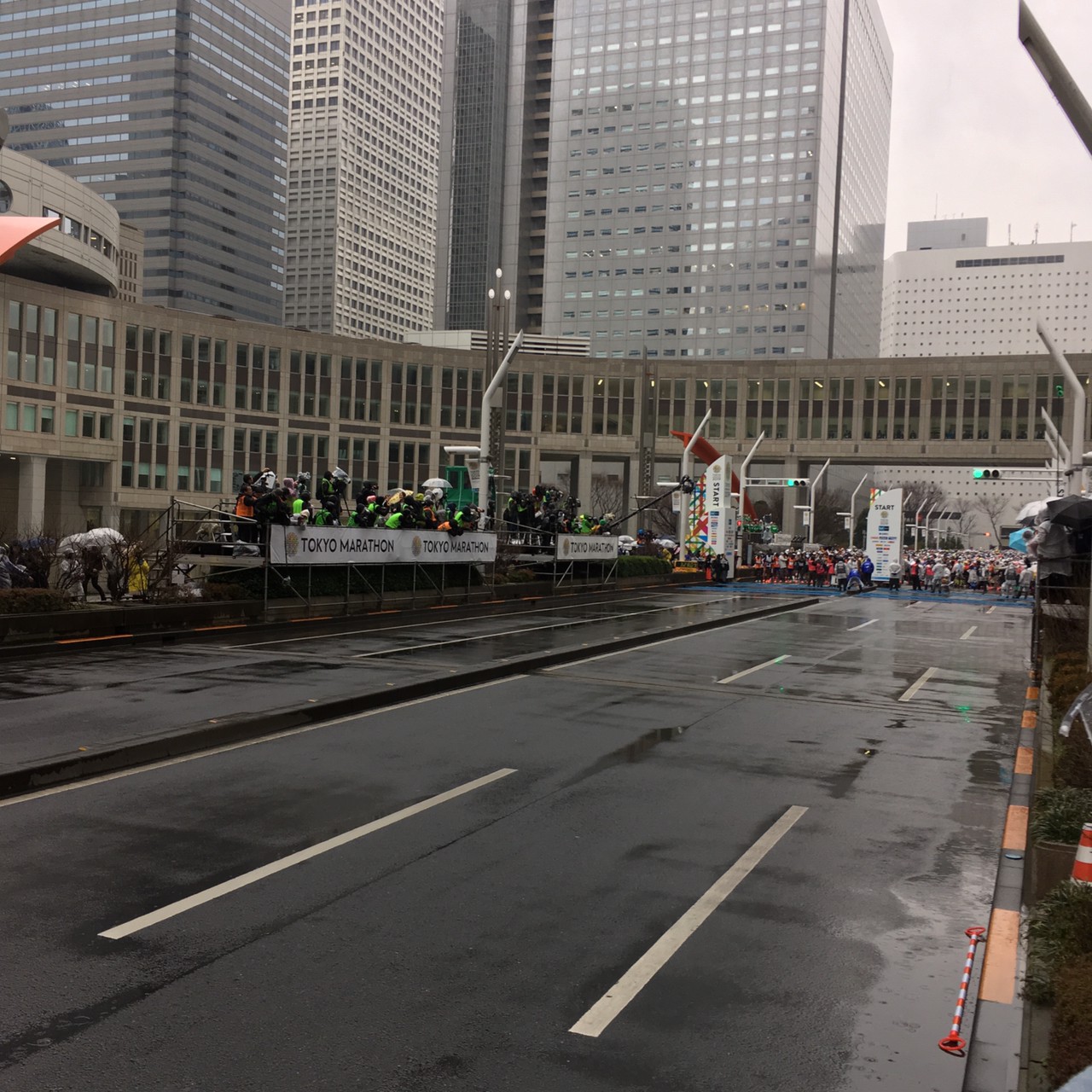 シャワーを浴びて、足裏にテーピングを施し、着替えて準備完了。例年に比べればそれほど寒く感じなかった。6時前の電車に乗り、6:45ごろ指定されたゲート3に到着。ここはチャリティ用なのか、3年連続で同じ場所。