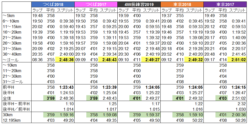 前置きが長くなったが、そろそろ本題へ。まず、直近レース+練習フルのタイムを、30kmまでと残り12.195kmに分割して整理してみる。