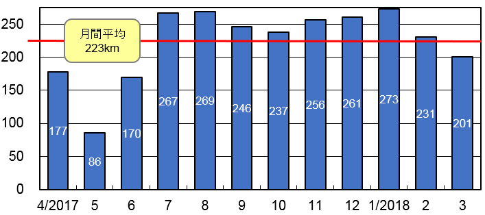 3月はまだ終わっていないので暫定だけど、ほぼ200kmぐらいになりそう。となると、年間の月間平均は223km。