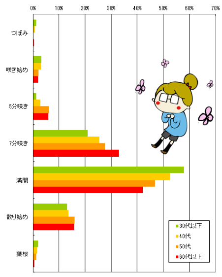 もちろん異論はない。興味深いのは、年を重ねるごとに、満開ではなく、7分咲き、散り始めがいいと答えた割合が大きいこと。