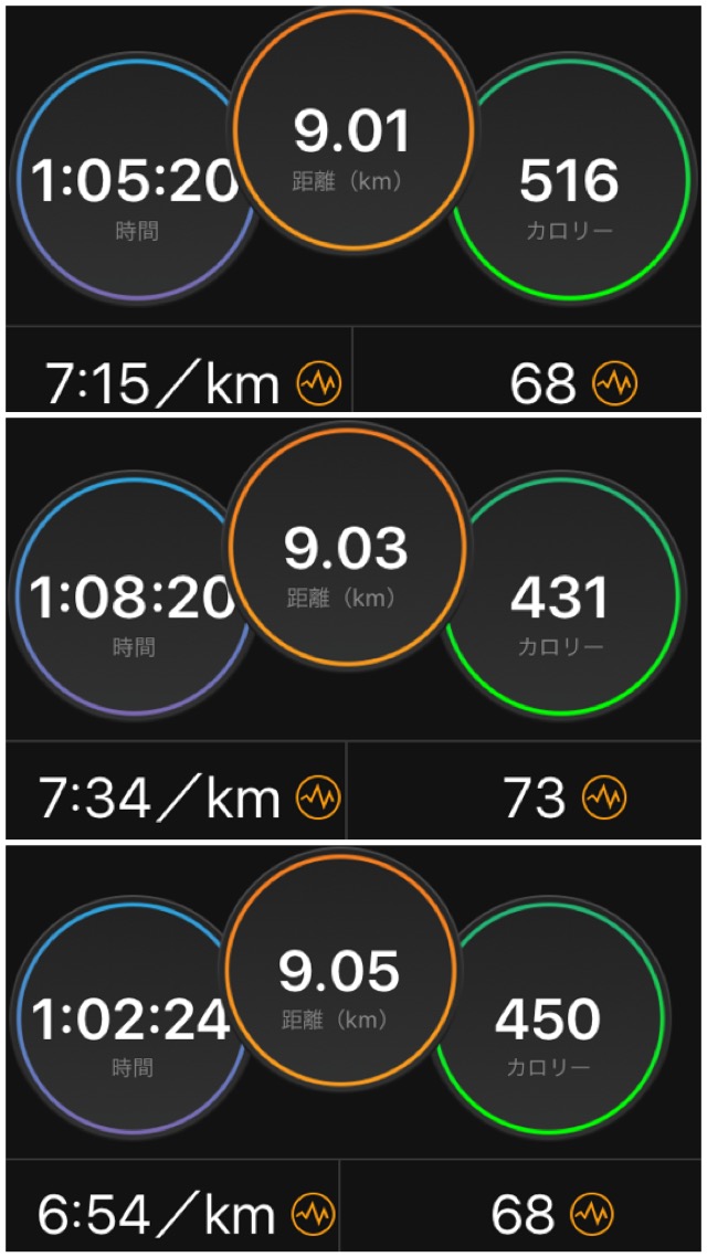 火木は夜、土曜は朝。いつもそうだが、同じペースで走っているつもりでも、明るいからか、土曜は7'00を切ることが多い。