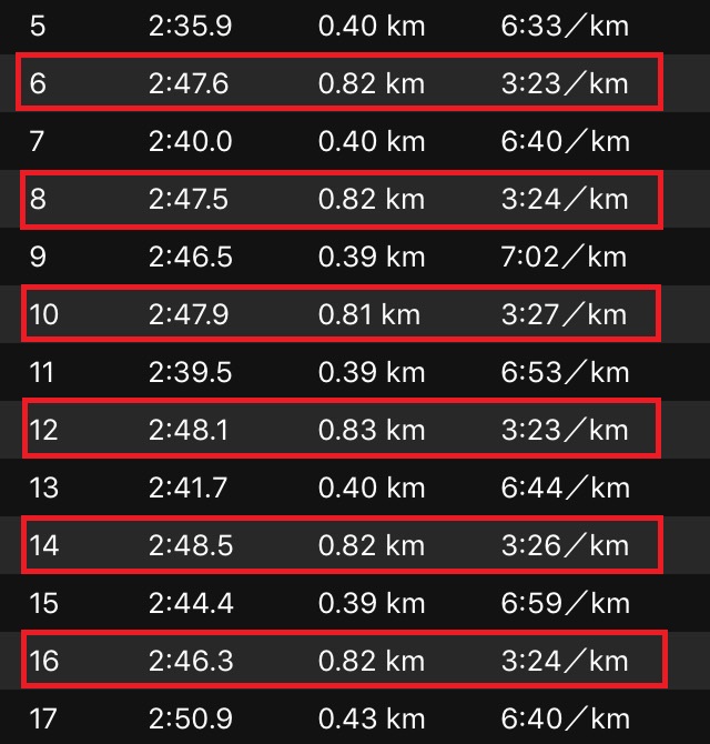 概ね、2'47~2'48の安定したタイムで完ぺきに10本クリア。しかも、前回に比べてレストのタイムが短く、2分35秒~45秒なのも好材料。