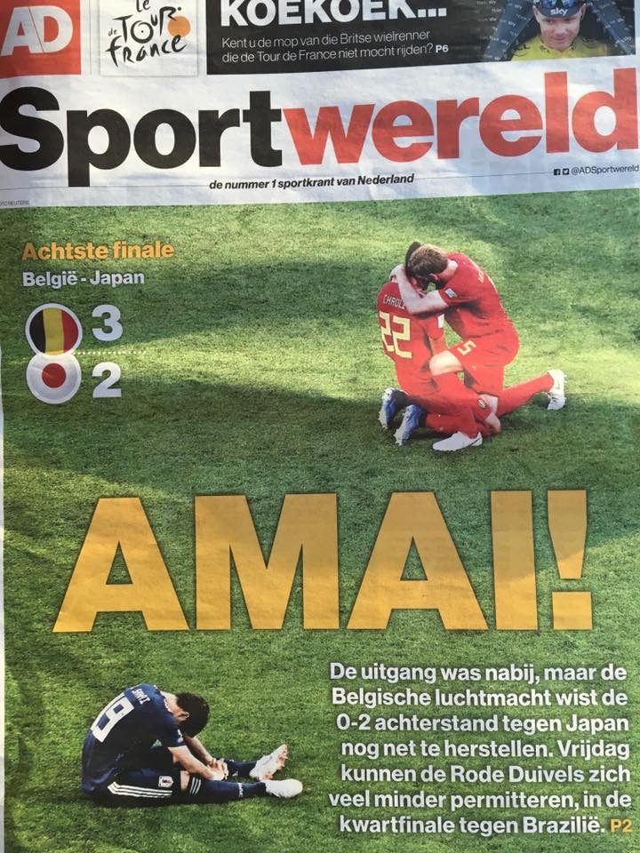 ヨーロッパに出張中の知人がFBにアップしてくれた、現地のスポーツ紙一面。現地の言葉で、驚きを表す間投詞らしい。日本語の意味を知った上での見出しなのかは分からないけど、両チームの写真の対比といい、お見事だ。