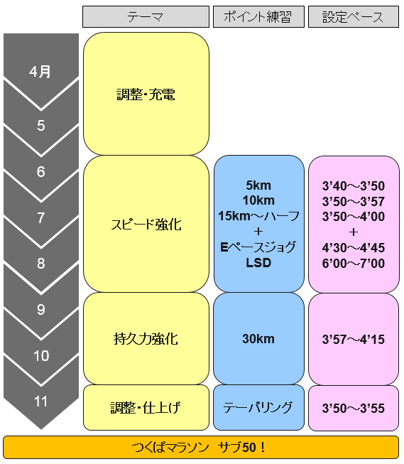 《11月のつくばに向けて、期分けをし、それぞれの練習テーマ、ポイントの内容、設定ペースをまとめてみた》