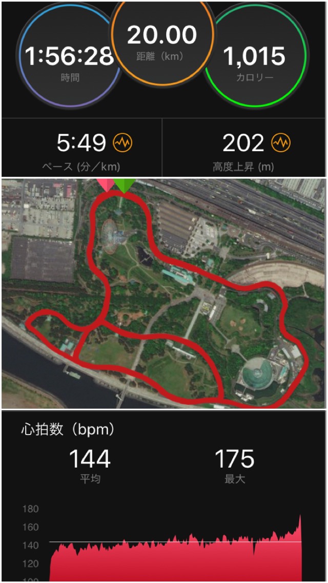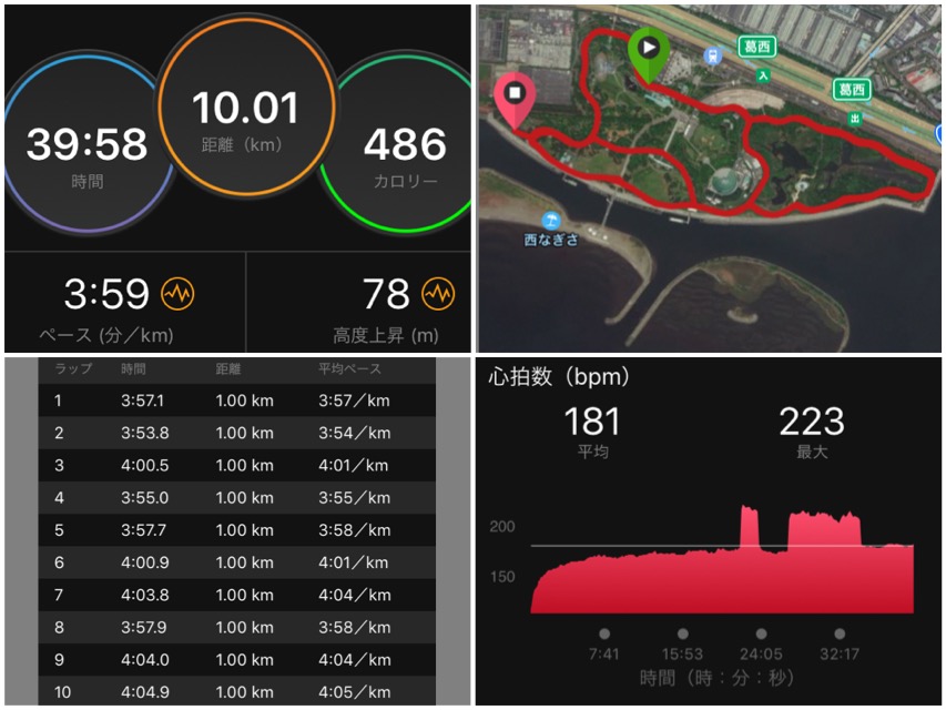 心拍数は明らかに異常値。気温27度で曇りだったからよかったものの、久々のキロヨン10kmは、きつかった・・・。