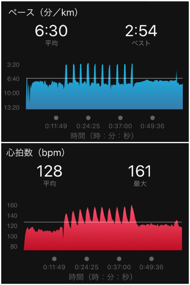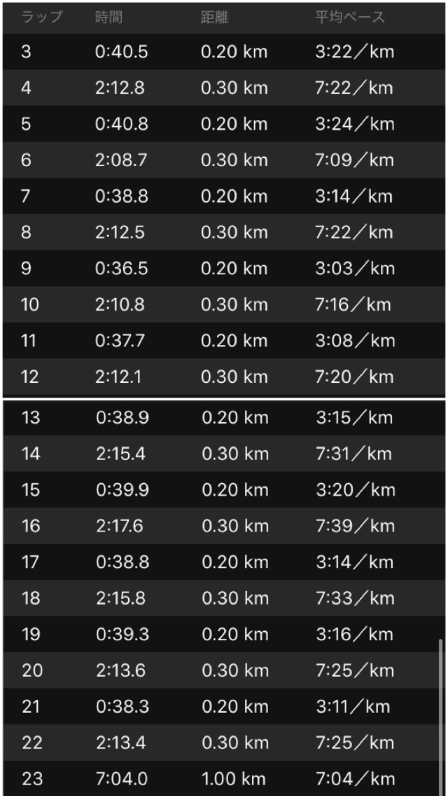 最初の2本は距離感をつかみ、慣れるために流す感じで。3本目からガチ。持久力を鍛えることが目的ではないと理解しているので、レストはゆっくり目で、呼吸をしっかり整えるようにした。