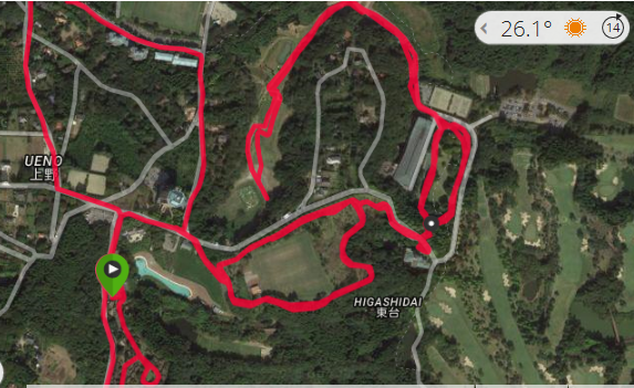 コテージ群を抜け、サッカーコートをぐるっと回り、トラックを走り、全長445mのロングジップスライドの広場、乗馬広場、リゾートの約8割ぐらい?をカバー。約1時間、8kmのジョグ。