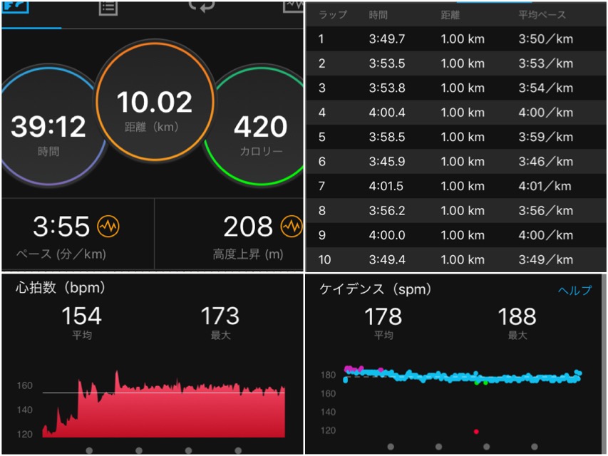 10km終了が39'09で、ギリギリ3'55を切ったemoji