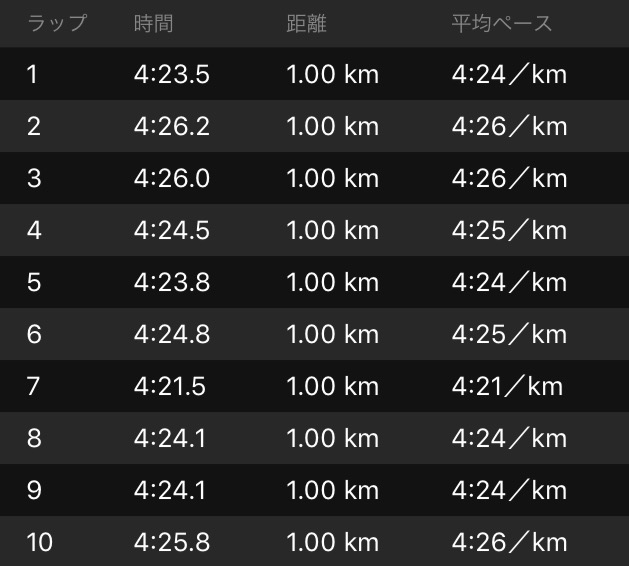 2時間11分25秒、平均4'23。設定はクリアできたが、ラストの余裕度がなく、一定ペースで余力を残して終わるというマイルールを忘れてしまった。