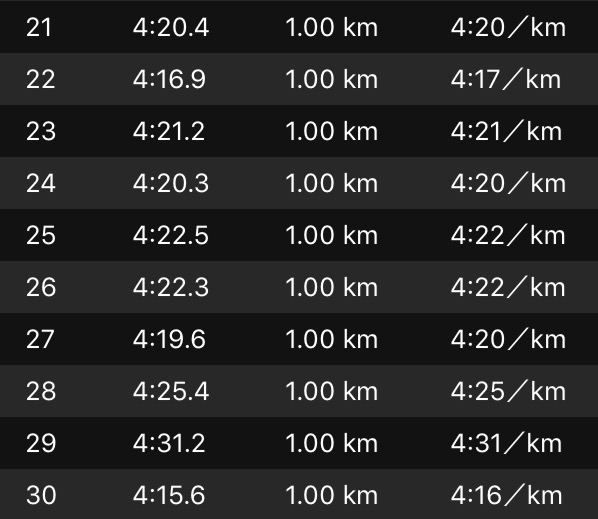 4'20との攻防戦もあと10km。ギリギリ粘っていたが、雨で重くなったシューズが地味に体力を奪っていた。久々に味わうロング走の苦しさ。