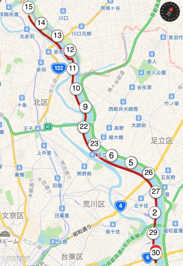 1回折り返すだけで30kmロングのコース取りができちゃう荒川河川敷(笑)。これがポイント練習のマイコースになるのかも。