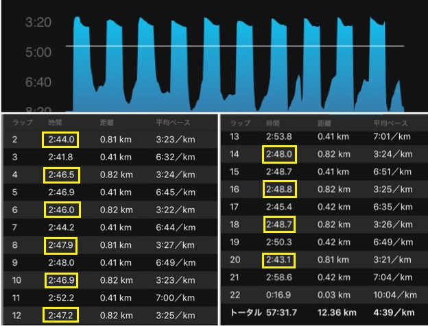 1本もミスなし、完璧にクリア。ペース配分も、グラフの通り、前半に貯金を作って、後半は無理せず走り切るようにした。ラストにスパートして2'50に間に合わせるような走り方だと、レストで回復しきれない。