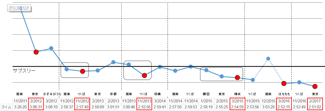 つくばと東京での敗因。どちらも30kmを2時間切って通過できていない。自分の過去データから、後半12kmでどれくらいペースが落ちるかは分かっているので、ある程度の余裕をもって、そこをクリアしないと、サブ50は見えてこない。