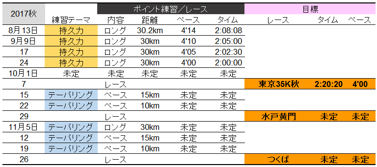 当面の目標は、10月の35K(そうです、正式種目です!)で、キロヨンをクリアすること。理想としては、単独走で30kmのキロヨンをカットしておきたい。