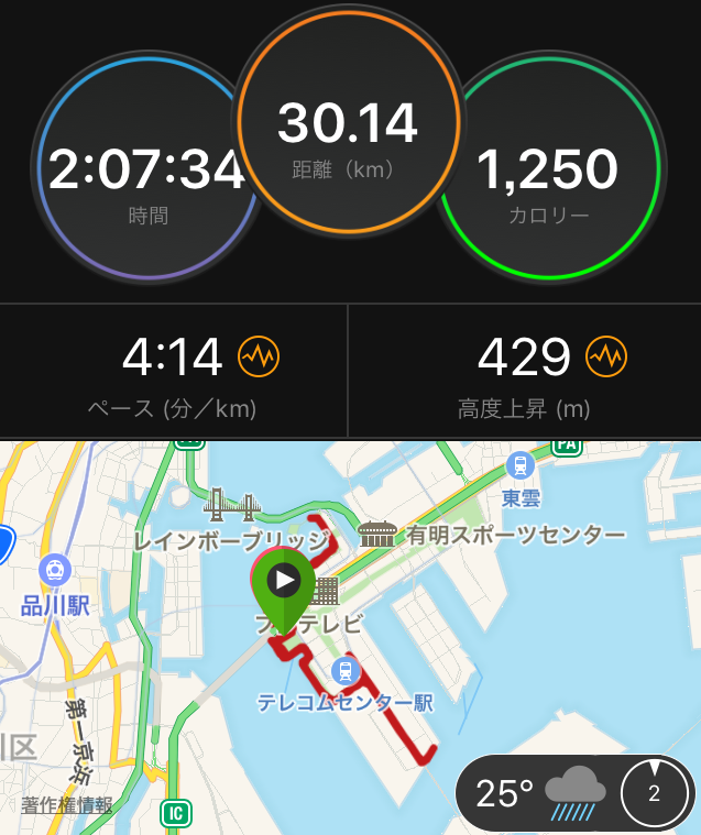 ちょうど1年前の記録と比べてみると、2時間7分11秒でタイムは僅かにいいが、平均心拍数154、最高心拍数169に対して、今日は157と172。気温は同じく25度前後。単純に比べれば、落ちてる・・・。