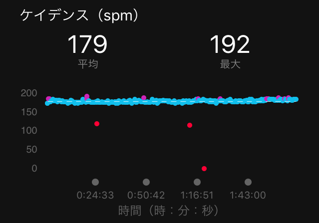 先週は意識し過ぎて失敗したので、今日はピッチは流れに任せてみた。結果、平均179回/分で、ストライド走の自分にしては悪くないと思う。