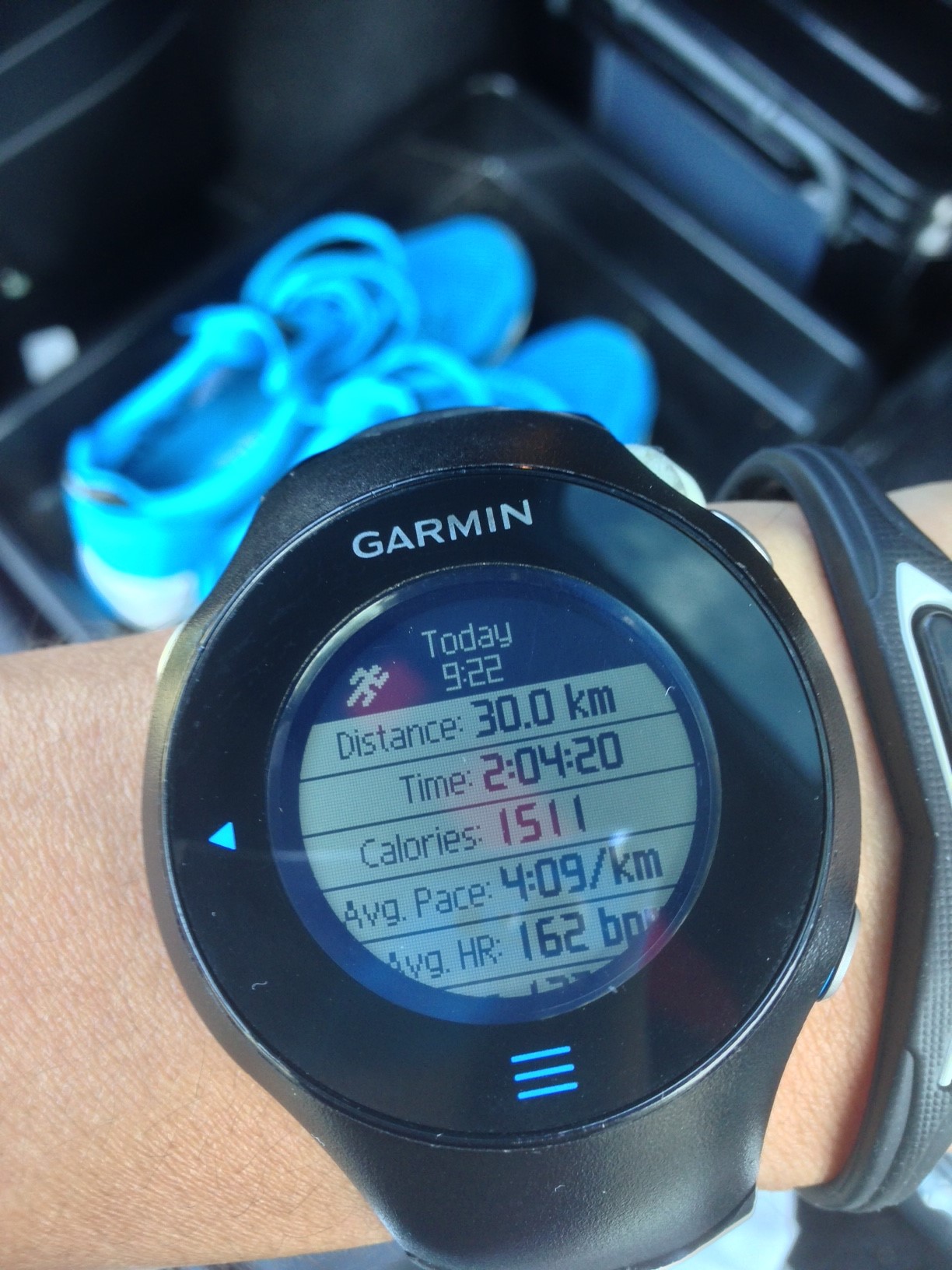最初の5kmは順調。暑さもそれ程気にならず、淡々とラップを刻む。次の5kmもなんとかラップは維持できたが、既に平均心拍数が165で、ほとんど余裕なし。そして10kmを過ぎてからは、体感では同じペースで走っているつもりがラップが4'10超えたりし、かなり苦しい。汗も結構な量。15km通過時には既に平均ペース4'08となり、21~27kmの間は4'10-15。ところが、28km目でふっと体が軽くなり、ラスト3kmは4'03、4'03、4'02と気持ちよくペースアップできた。