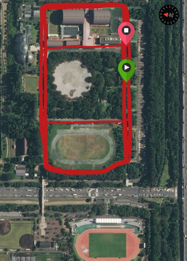 初めて走ったコース。1周約1.3km。道幅が広く走りやすい。大きなGPS誤差は感じられなかったものの、データを見てみると、そうでもなさそう。