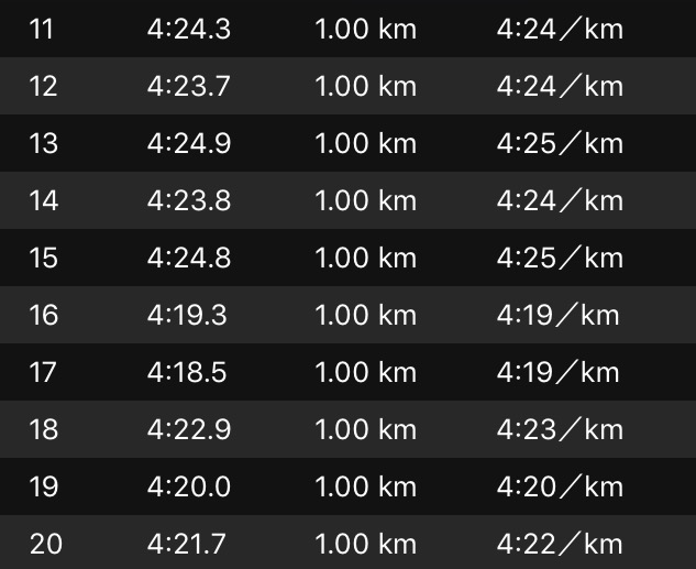 4'20との攻防戦もあと10km。ギリギリ粘っていたが、雨で重くなったシューズが地味に体力を奪っていた。久々に味わうロング走の苦しさ。