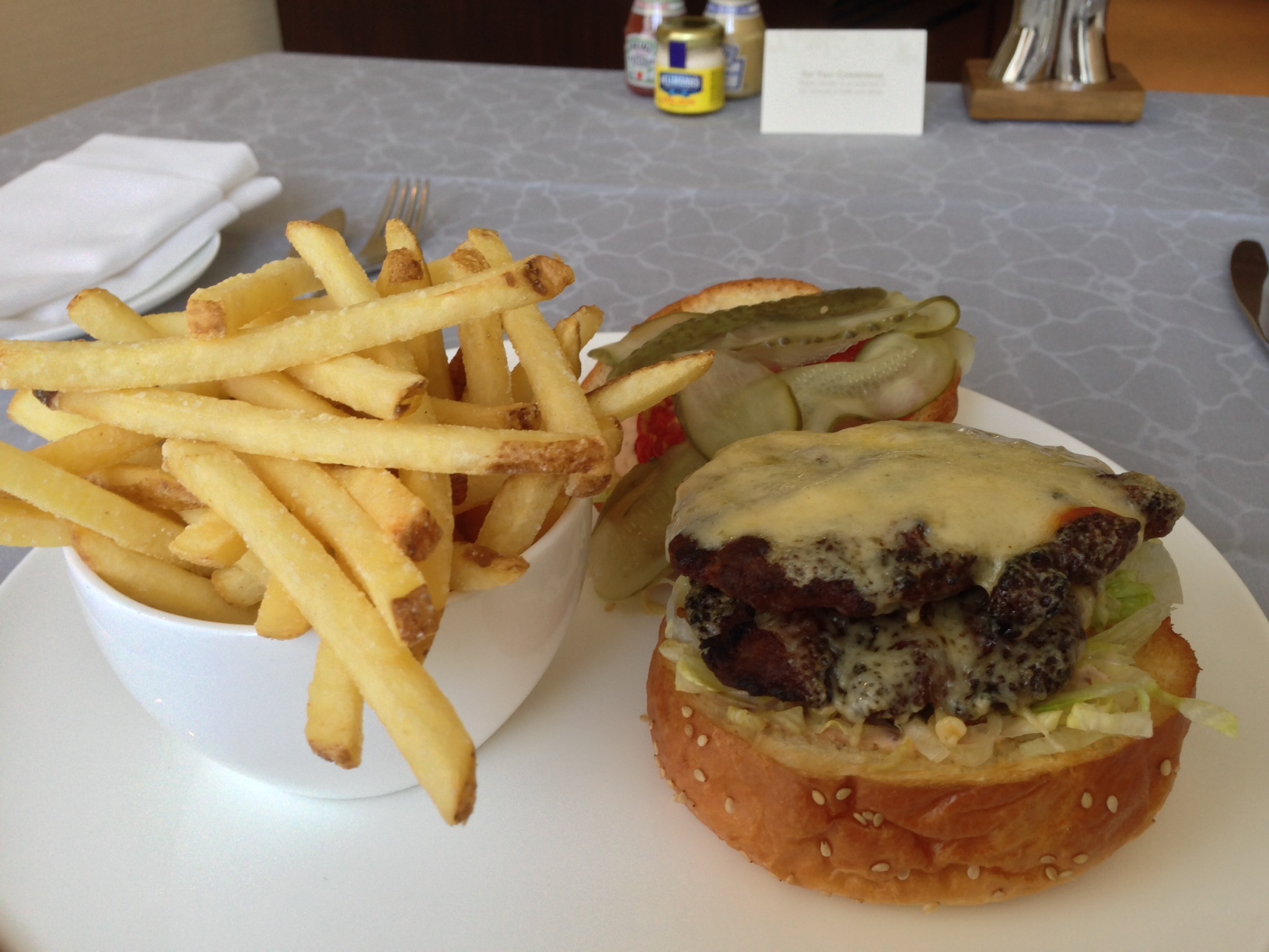 10:15のフェリーに乗ってホテルへ戻る。メチャクチャお腹が空いていたので、カフェでドーナツとクロワッサン・チキンサンドのセットをテイクアウトして食べるものの、それでも足りず・・・、ハンバーガーをオーダー。これがかなりのボリュームで、ジューシ+カリカリで美味しかった。