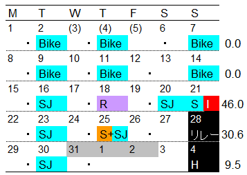(SJ: 疲労抜きジョグ、R:ジョグ、S:スピード練習、I:インターバル、・:筋トレ)