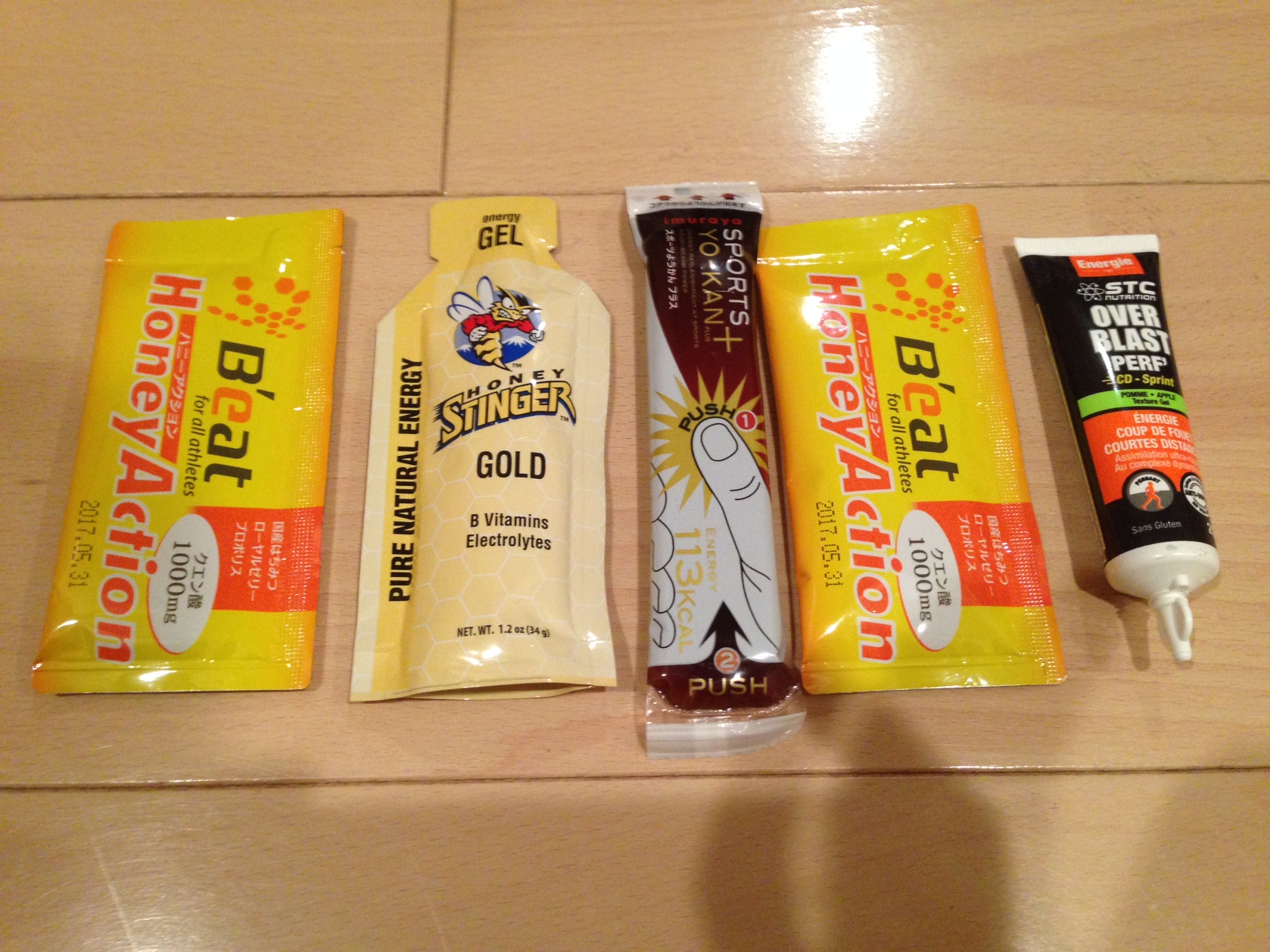 用意した補給食は、蜂蜜系のジェル、スポーツ羊羹、OVER BLAST、あとは塩熱サプリやらBCAA顆粒など。シューズはJapan boost 2。