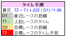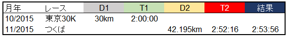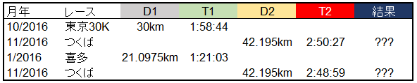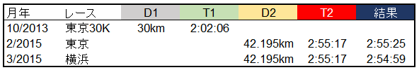 昨年は、30kmで初の2時間切り(1:59:26)を達成できた余韻に浸り続け(笑)、その後調子を上げ続けることができず、しかも数日前に体調を崩しかけたりもしたので、目標はPBを約1分更新の54分切りとした。基準となる30km(D1)のタイム(T1)を保守的に2時間とし、はじき出された予測タイム(T2)は2:52:16だったので、目標クリアは大丈夫だろうと信じた。35km以降、平均ペースが4'13まで落ち込んだが、ギリギリ達成。