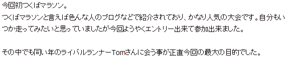 彼がつくばにエントリーしたことを知った時、一緒の大会を走れて嬉しいと思う反面、軽~いプレッシャーがあった(笑)。持ちタイムが同じぐらいなら並走もありだが、彼だってファンランでわざわざ遠征はしない。