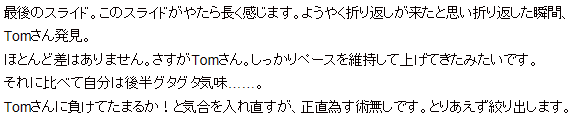 レポでは初めて書いたが、そのことを僕はブログにはあえて書かなかった。いや、書けなかったというほうがしっくりくる。事前に宣言して、一緒に達成できれば、そりゃブログのネタ的にも美味しい(笑)。