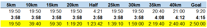 レースプラン、過去データとにらめっこした結果がこちら。至ってシンプルで、30kmまで3'58前後、2時間切りで通過し、後半12.195kmを粘り倒す。