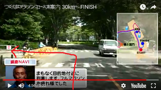 つくばのコースに当てはめると、42kmの距離表示を左前方に捉え始めた頃。すぐに左折して陸上競技場へと入っていく辺り。