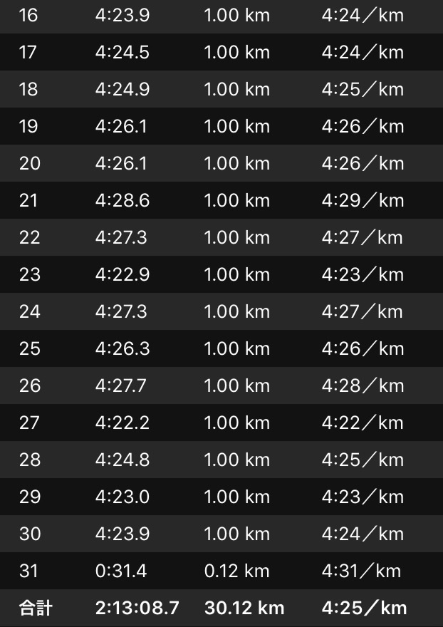 30km地点は、2:12'37、ペース4'25。ほぼ一定ペースで走れた。