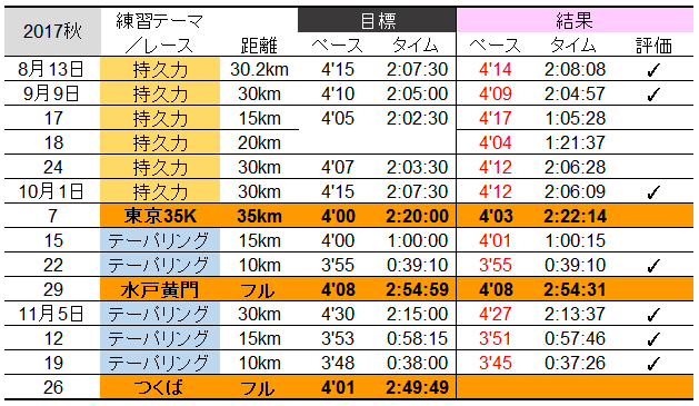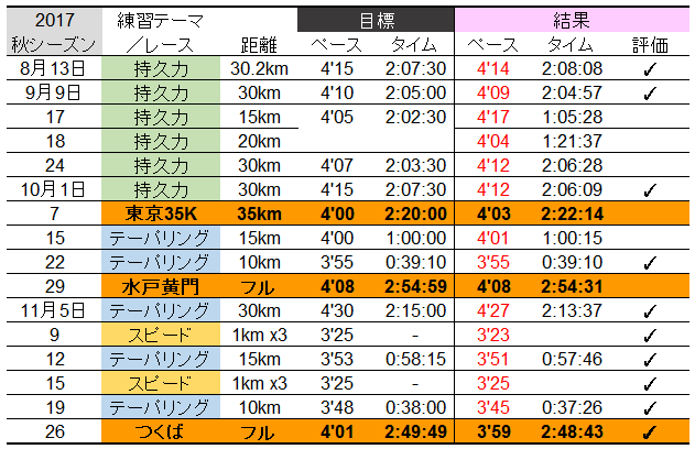 2017年秋は、水戸黄門をステップレースにしたのが理由ではあるものの、30kmはEペースに切り替え、その代わり15kmと10kmは本番目標ペースよりそれぞれマイナス10秒と15秒ぐらい。