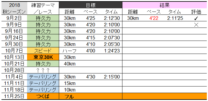 3週間前からテーパリングで、Eペースの30km、レースペースよりも速い15km、10kmを経て、つくばに挑む。
