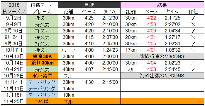 気温28~30度の8月中旬にサブスリーペースでクリアできたものの、その後は調子が上がらなかった。東京35Kでは、不甲斐ない結果に終わった。