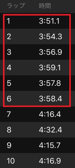 1人のランナーがとんでもないスピードで飛び出し、7人?ぐらいの集団が続いた。序盤は追風。集団走なので入りはちょっと速い3'51。だんだん自分のペースも落ち着き、最初の折り返しまで3'54~3'59。