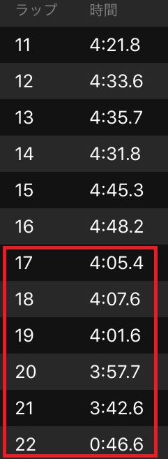 17km手前で折り返し。追い風になったし、急にスイッチが入った。なぜかは、自分でも分からない。単なる意地なんだと思う。脚にも力が入るようになり、一気に4'05まで戻せた。