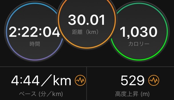 Eペースの4'45で、30km。ペースは楽だし、天気はいいし、快適にロングジョグ終了。心拍数は、出だし明らかに異常値だが、平均で133とかなりいい。フルマラソンの疲労は抜けきった。
