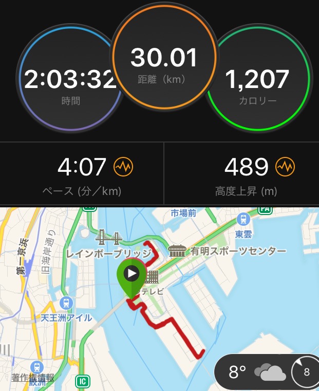 東京マラソンの3週間前ということで、セオリー通りの30km走。ペースは無理せず、やはり、ある程度の余力を持って終われることを重視。