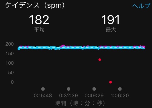 ピッチ数は182、ストライド141cmで、これもいい結果。