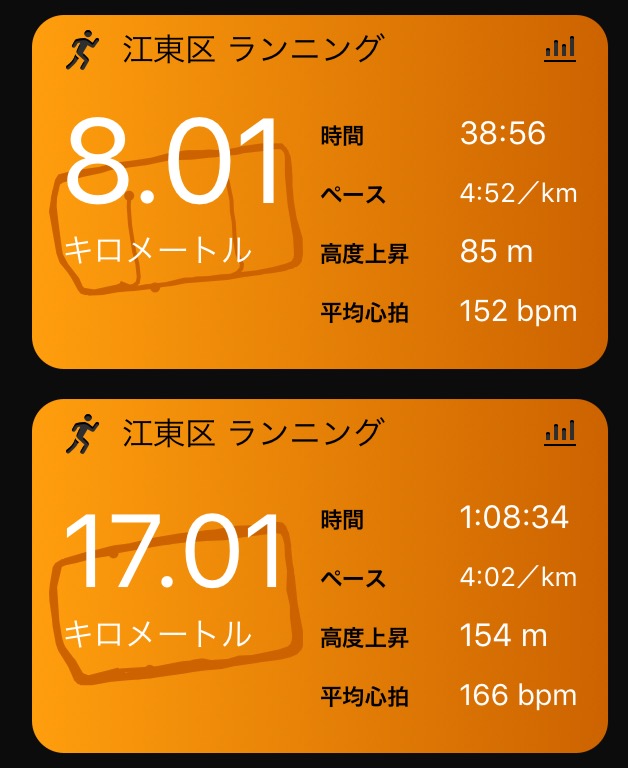 4'05を目安にハーフまで粘ろうかと思ったけど、これ以上無理するのは良くないと判断し、17kmで終了。平均ペース4'02。